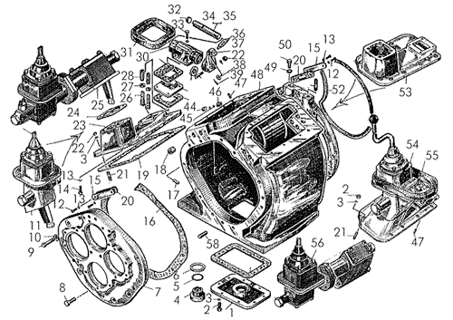 Корпус коробки передач с механизмами переключения, крышками и деталями крепления