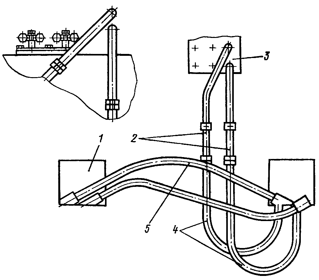 Снимите с двух крайних правых труб, идущих от распределителя 3 (рис. 334) назад, заглушки и закрепите на них трубы 2. Установите на трубы 2 два рукава 4 высокого давления. Соедините гидроцилиндры 1 рукавами 5 высокого давления.