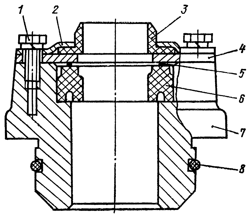 Отверните четыре болта 1 ( рис. 198 ) и снимите крышку 2, воротник 3 и пластину 4. Выньте из отверстия крышки 7 манжету 5 и манжетодержатель 6. Снимите, при необходимости, уплотнительное кольцо 8.