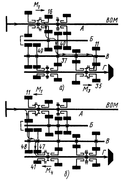 В теплое время года масло идет по большому кругу и охлаждается в радиаторе, который устроен, как и масляный радиатор двигателя. Маслом смазываются следующие точки коробки передач и главной передачи: втулки шестерен (стрелки г и д), правый (стрелка е) и левый (стрелка ж) подшипники.