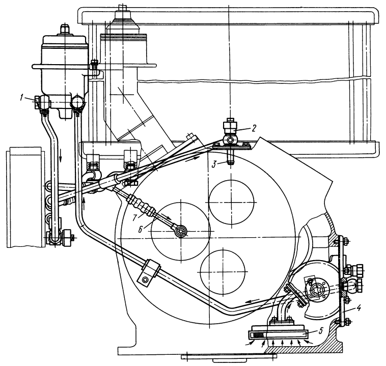 Рис. 76. Смазочная система трансмиссии (вид сбоку) Т-130М