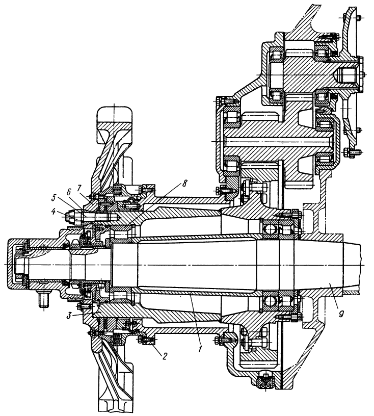 1 — трубка подвода масла к левому подшипнику главной передачи,